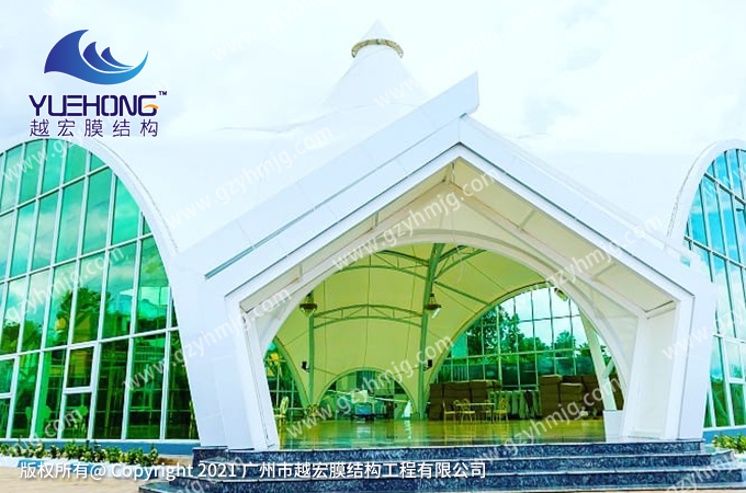 在今次的宴會廳膜結構案例中,所設計出寶塔型的膜結構,及選用玻璃墻整體搭配,體現出宴會廳高端大氣。獨特的外觀能巧妙的成為風景中個性化建筑美,整體空間建筑能讓人感覺是非常高檔的一個場所。此案例施工方面,按質量驗收統一標準,短期內大概25天完工。