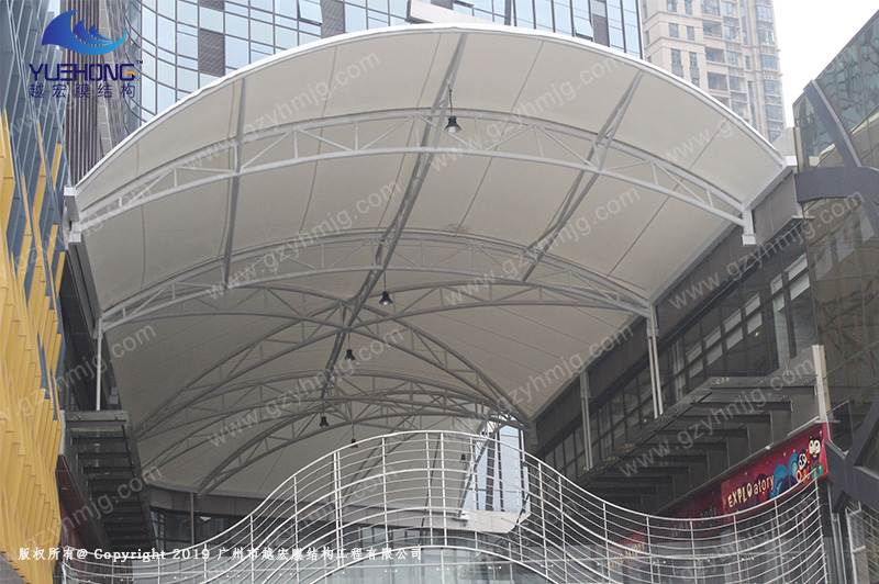 此款膜結構遮陽棚,我司能夠提前工程驗收安全保質,確定了膜結構安裝穩固與使用安全,在我司施工隊團結精神,專業的安裝技術方面,能盡快的完成了施工工作。以其獨有的優美曲線造型和獨有透光率的遮陽棚,能提升了商業區的美觀與恰好的實用。